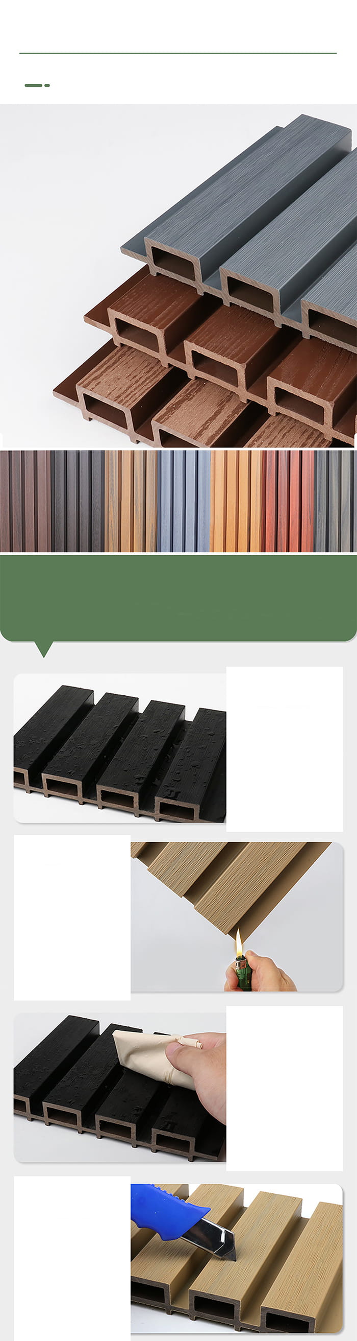 Pemeriksaan kualitas: Selama proses produksi, panel luar ruangan WPC diperiksa secara ketat kualitasnya, termasuk keakuratan dimensi, kerataan, kepadatan, ketahanan api, kinerja perlindungan lingkungan, dll.