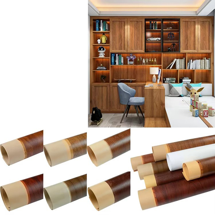 Furnitur panel : Serat kayu imitasi dan veneer butiran batu (seperti tekstur kayu ek, kenari, marmer) untuk meningkatkan nilai tambah produk.